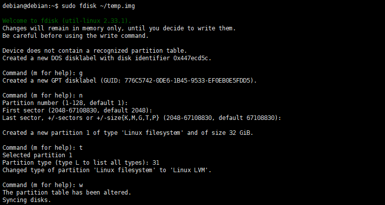 第二种是在pve更目录下创建一个虚拟磁盘。容量不用太大,32G足够。然后将虚拟磁盘挂载到loop,再用fdisk创建Linux LVM分区。这样的好处就是不用新加一块硬盘,缺点就是必须保证pve根目录空间够大。
