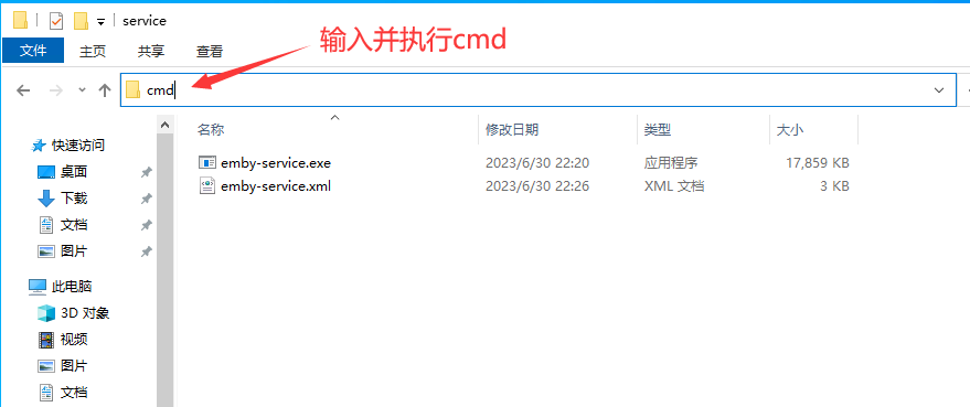 进入到service目录。在地址栏输入cmd,打开命令行。