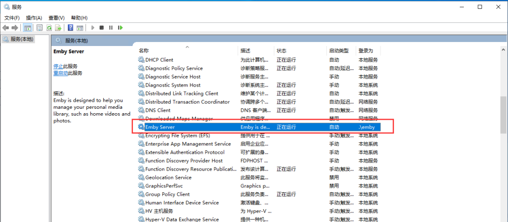 成功执行之后,在服务管理管理器中将会看到已经启动的Emby服务。