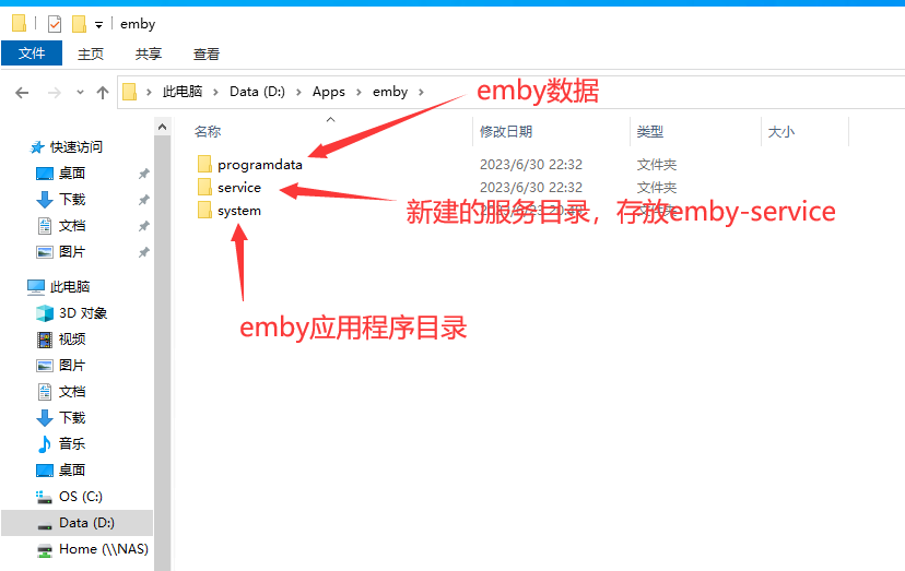 这上面的目录结构下,就算每次重新安装emby的应用程序,都不会丢失数据和影响服务程序。