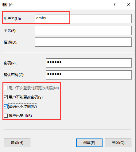 填写一个用户名,这里以emby为例: