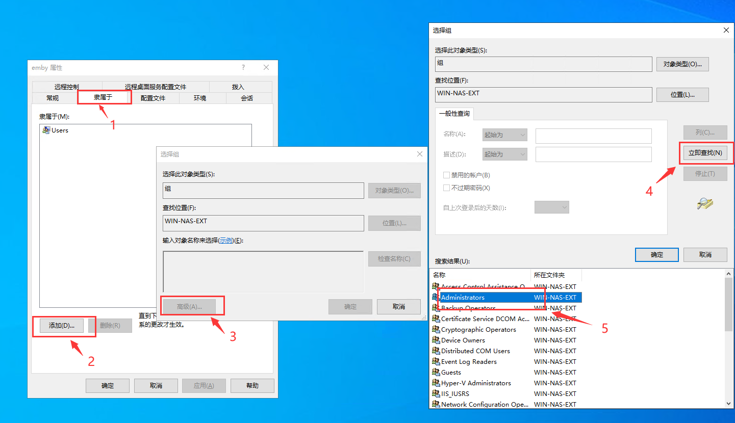 要想能够顺利访问NAS共享目录,就需要让启动服务的用户具有访问NAS共享目录的权限。winsw这个小工具,支持配置为特定用户启动服务。但是在配置之前,我们得先让Windows中有这个用户。