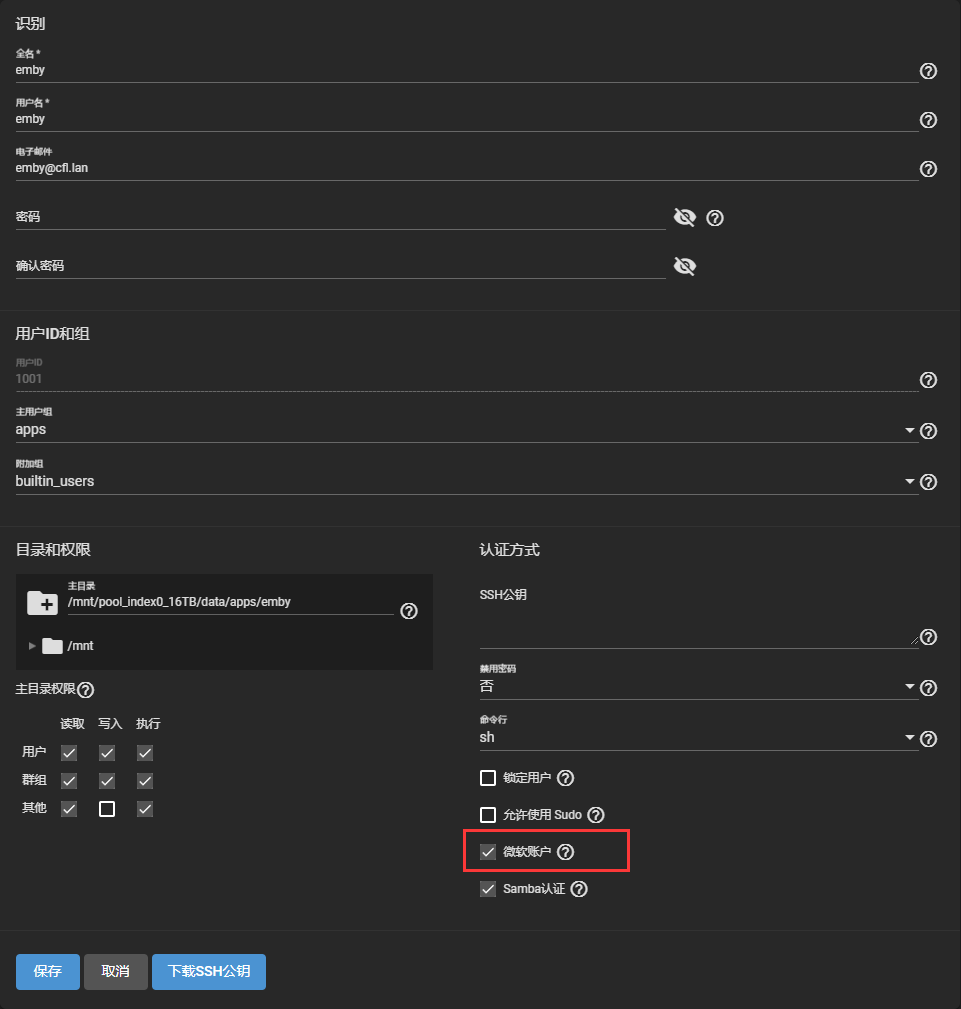 这里已TrueNAS为例。我已经创建好emby这个用户,特别注意的一点就是需要勾选微软账户这个选项。