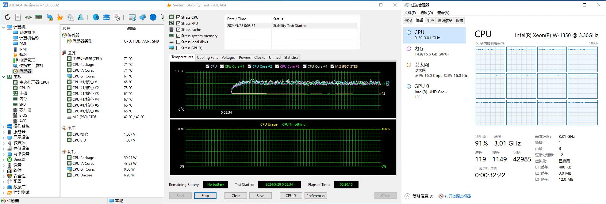 BIOS中设置性能模式,CPU为W-1350,功耗墙应该是50w,室温24度,烤鸡20分钟。温度维持在70度左右。不愧是11代大火龙!