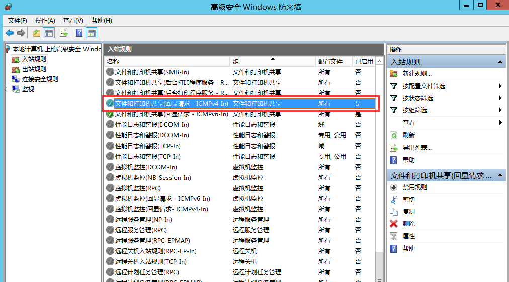在虚拟机防火墙的入站规则中找到“文件和打印机共享(回显请求- ICMPv4-In) ”,然后启用即可。